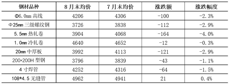 分品种来看,钢铁网监测的8大钢材品种10大城市均价显示,8月底,除无缝管价格略有上涨外,其他各品种价格与上月底相比均有所下跌,其中热轧卷下跌164元/吨,跌幅4.0%,为跌幅大品种;冷轧卷跌幅小,较上月底下跌12元/吨,跌幅为0.3%;其他品种跌幅在1.1-2.9%之间(详见表1)。